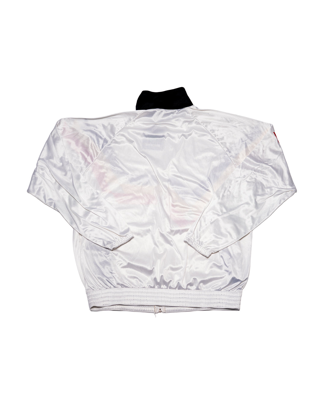 Felpa con zip ABM Germania Hockey '90 , acetato bianco, decoro geometrico racing rosso-nero-giallo, collo alto nero, zip centrale, logo ricamato. Vestibilità regular