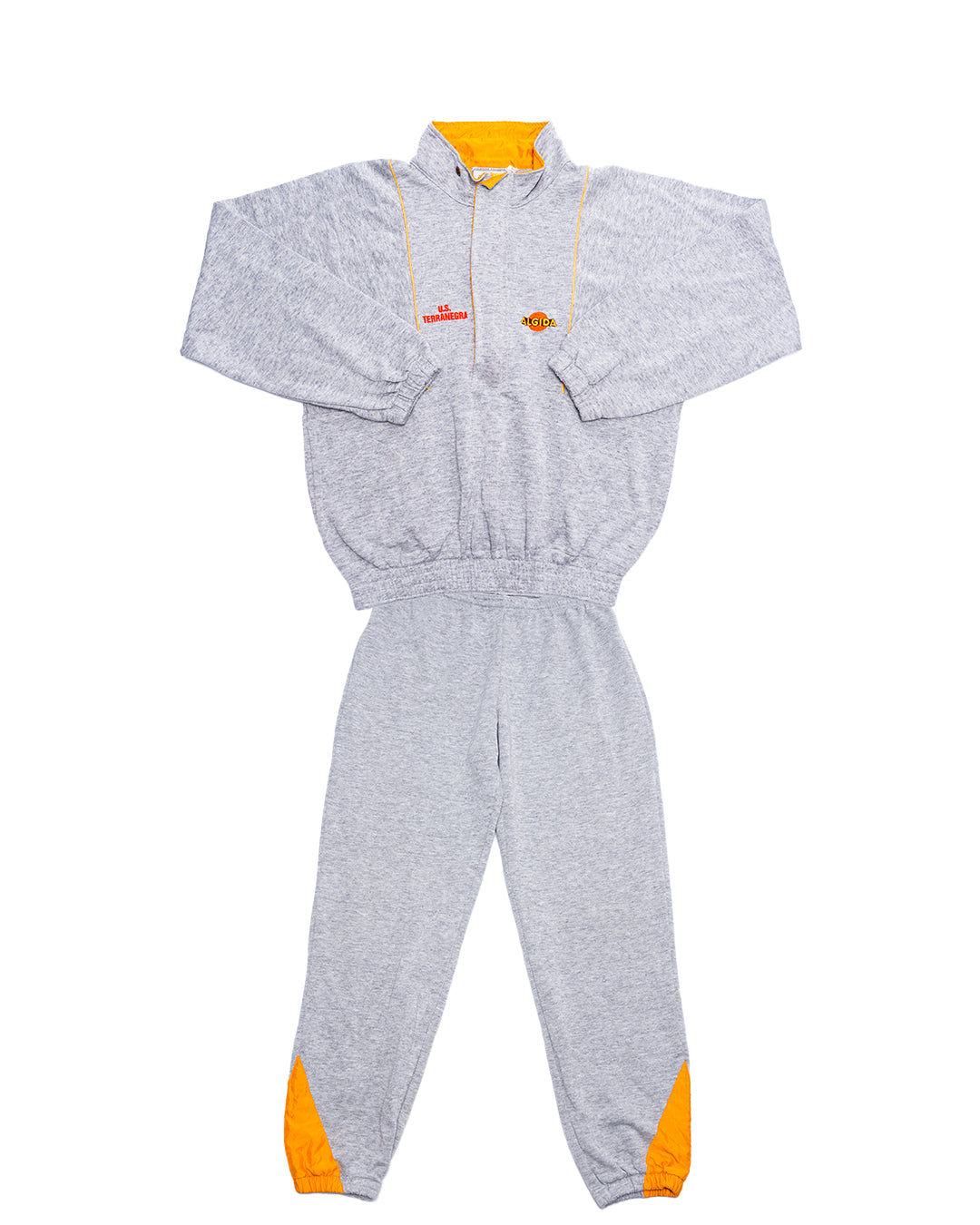 Felpa vintage Algida grigia, originale anni ’90, collezione esclusiva realizzata da Anobi Cardano al Campo (VA). Modello con zip parziale, collo alto e dettagli arancione/giallo, logo Algida e ricamo US Terranegra. Tessuto misto cotone di elevata qualità, tipico del periodo, con vestibilità ampia ed elastico al fondo e ai polsi.
